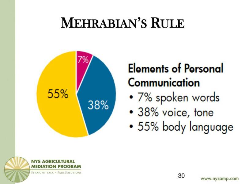 Voor Albert Mehrabian zijn deze 3 elementen, op een verschillende manier, verantwoordelijk voor het gevoel dat we krijgen bij het overbrengen van een boodschap: de woorden zijn verantwoordelijk voor 7%, de intonatie/klank voor 38%, en de lichaamstaal voor 55% van die voorkeur. Ze worden vaak afgekort als de “3 V’s,” voor Verbaal, Vocaal en Visueel. Voor een werkzame en zinvolle communicatie over emoties, moeten deze drie gedeelten van de boodschap elkaar ondersteunen – ze moeten in overeenstemming zijn. In het geval dat er sprake is van geen overeenstemming, kan de ontvanger van de boodschap geïrriteerd raken doordat er 2 boodschappen via verschillende kanalen overkomen, die 2 verschillende richtingen aanduiden.